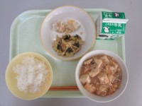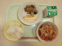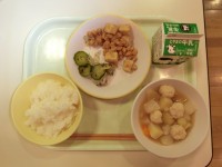 今日の献立は、コッペパン、牛乳、豚肉の香り揚げまたはえびカツ、そえ野菜、春雨スープ、りんごゼリーまたはメープルマフィンです。