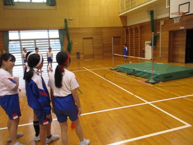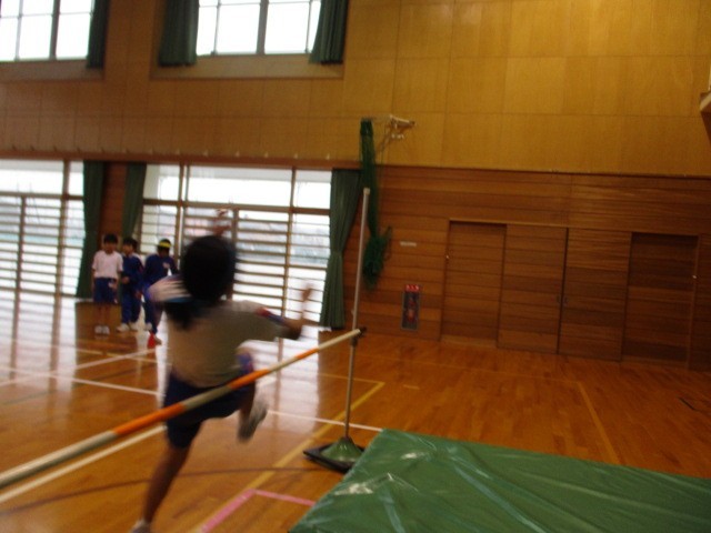 体育科の高跳びでは、子供たちの腰ぐらいの高さのバーを、5~7歩で踏み切る練習をしました。中には背面跳びができる子も出てきました。
