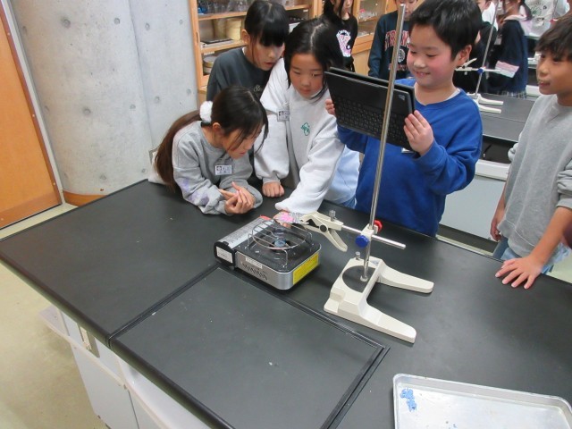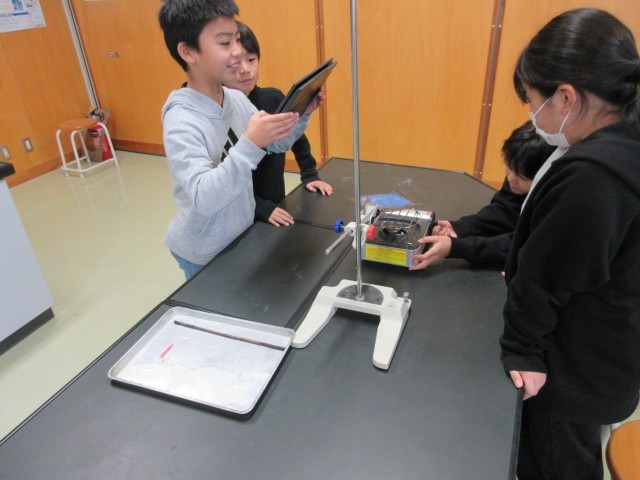 理科で物の温まり方の実験をしています。
