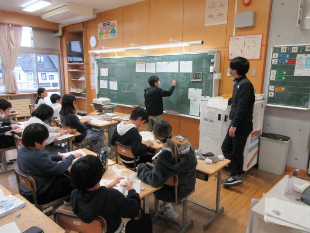 算数科の学習で、平行四辺形の面積の求め方を色々な方法で考えています。