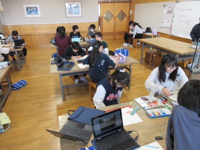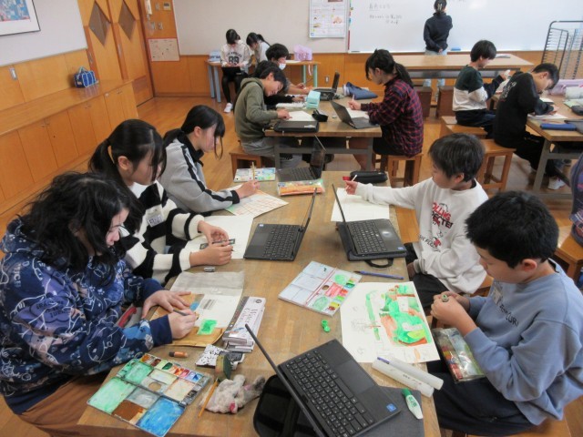 図画工作科で思い出の場所の絵を描いています。今日は丁寧に色塗りに取り組んでいます。
