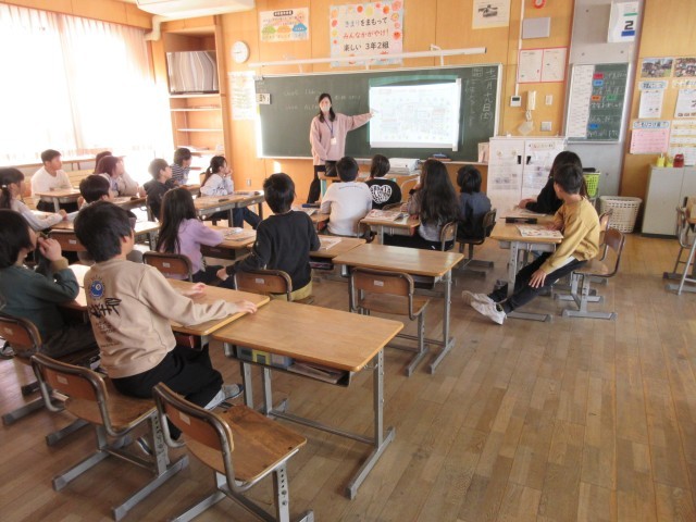 外国語活動の学習で、アルファベットの発音練習に取り組んでいます。