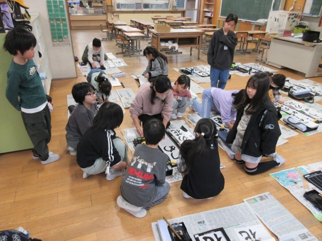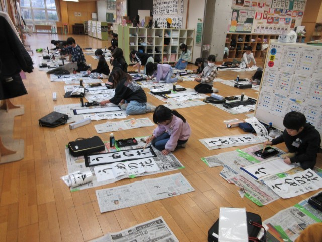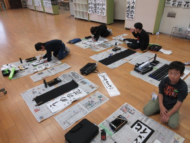説明をしっかり聞いて、書初めに集中して取り組んでいます。