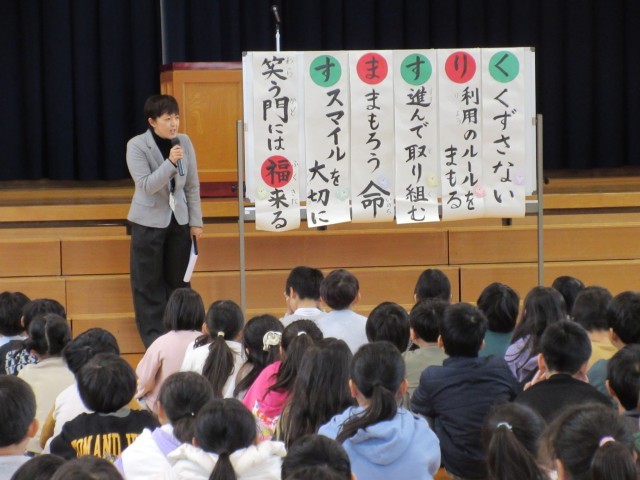 生徒指導の先生から、冬休みの過ごし方についての話を聞いています。