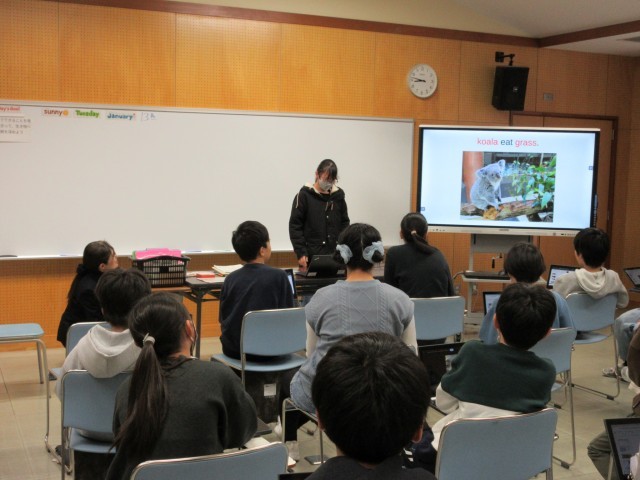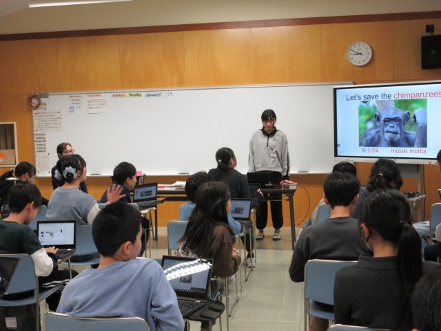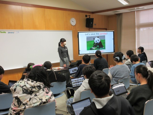 外国語の学習で、自分で作ったプレゼン資料を英語で発表しています。