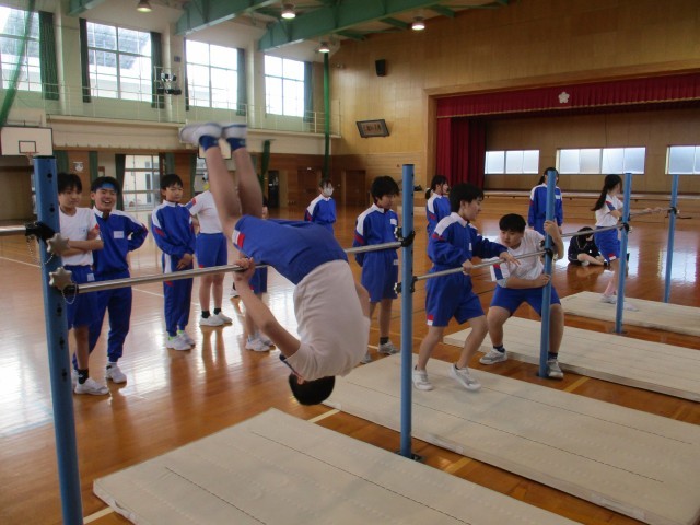 体育科では、鉄棒運動の学習が始まりました。できる技を増やそうと、アドバイスし合いながら挑戦しています。