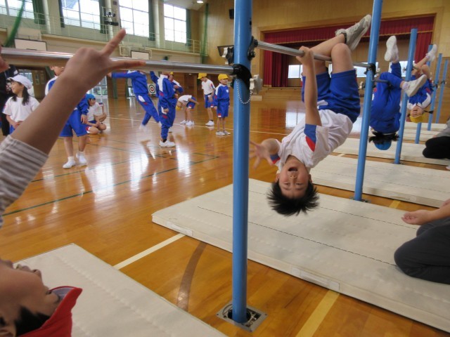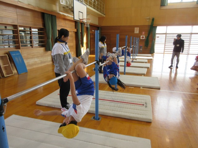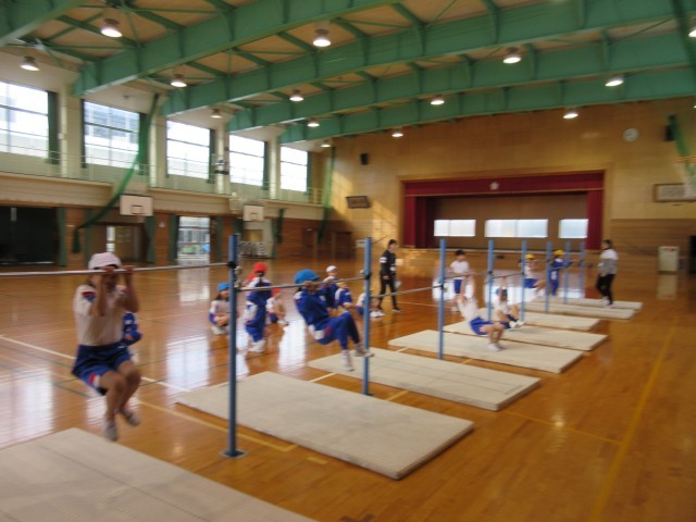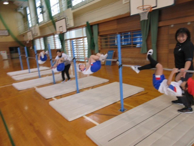 2限目、3限目に富山市スポーツ協会の指導員の方が来られて、鉄棒の指導をしていただきました。
