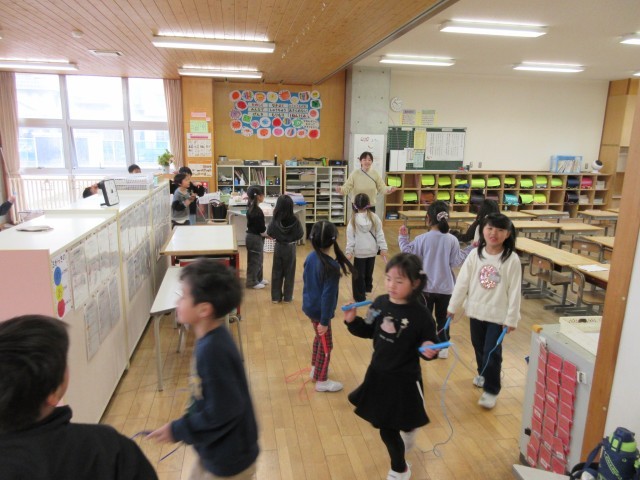 1年生も体力つくりで縄跳びに取り組んでいます。どんどんできることが増えています。