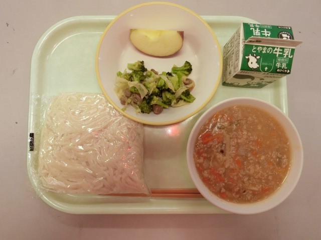 今日の献立は、ソフト麺、牛乳、ソフト麺の肉みそ、ビーンズサラダ、りんごです。