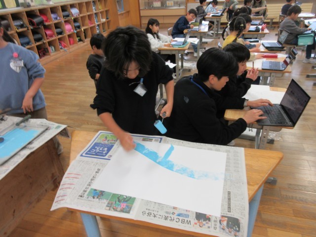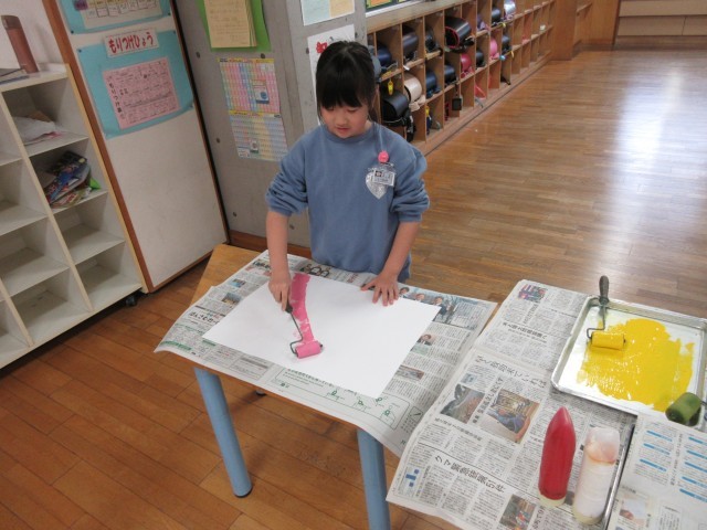 図画工作科で、ローラーを使い画用紙に色を付けています。