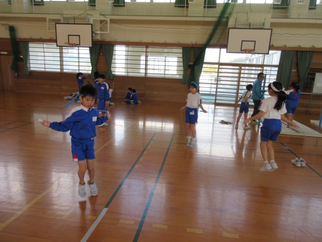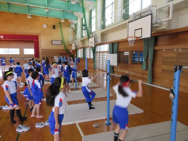 体育科の学習で、縄跳びや鉄棒で色々な技にチャレンジしています。