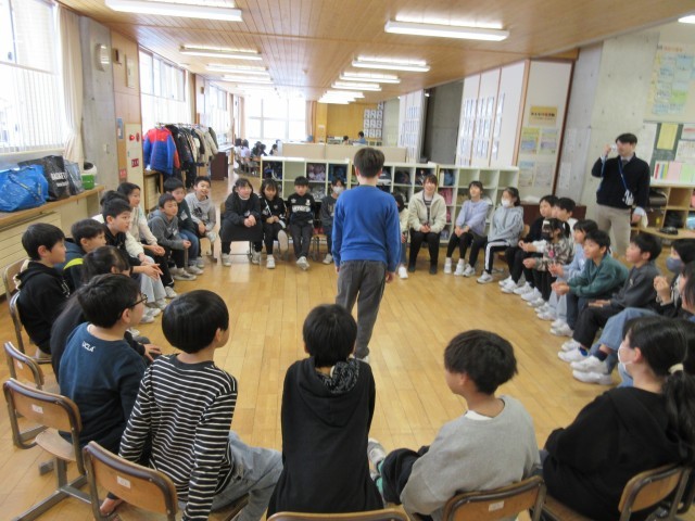 1限目の後半は、車座になってゲームを行い仲を深めています。