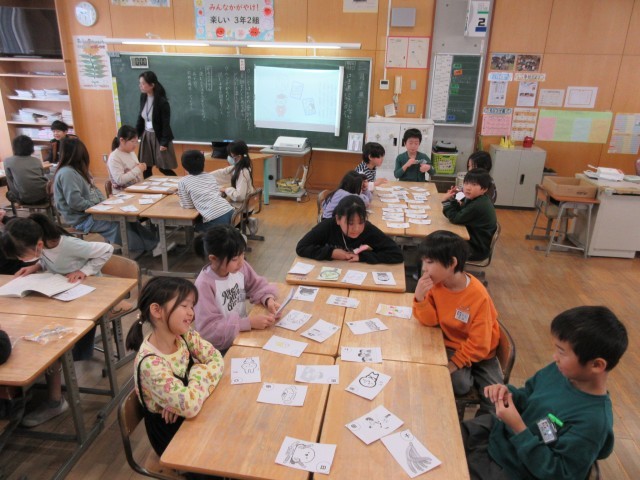 1限目は国語科の学習で、かるたを作りそれを使って楽しんでいます。