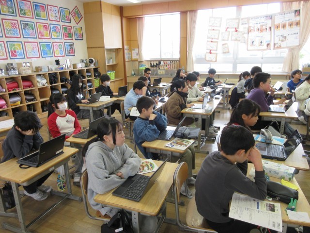 音楽科の学習で、日本の伝統的な音楽の旋律を聴き比べています。