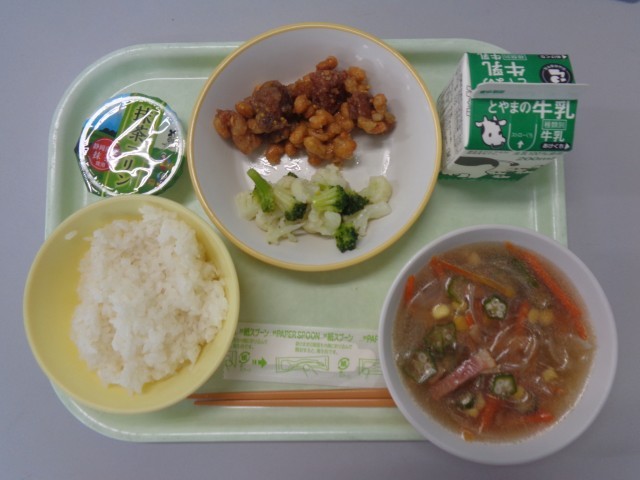 給食週間4日目、音楽にまつわる献立です。献立は、ごはん、牛乳、豚肉と豆のハニーマスタードからめ、花野菜サラダ、きらきらぼしスープ、お茶プリンです。