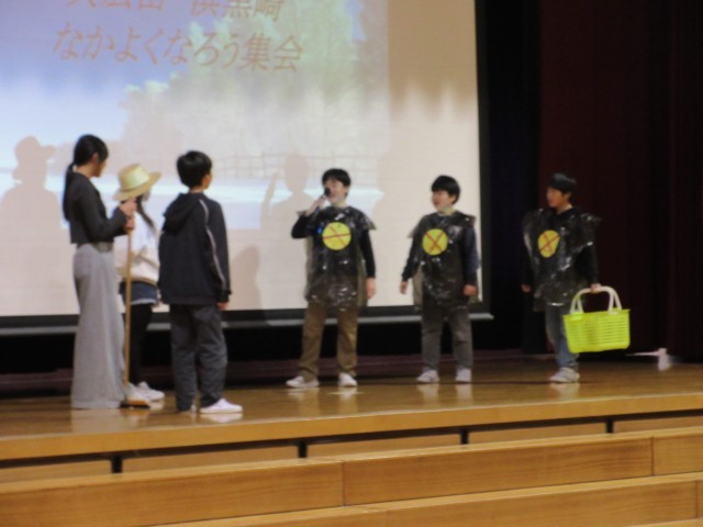 劇やクイズ、全校合唱などで交流を深めました。また、大広田小、浜黒崎小のお互いの校歌を披露し合いました。