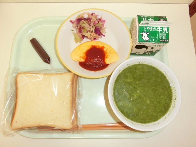 給食週間最終日、図工にまつわる献立です。献立は、食パン、牛乳、オムレツのトマトソースかけ、紫キャベツのマリネ、ほうれん草のポタージュ、チョコペンです。