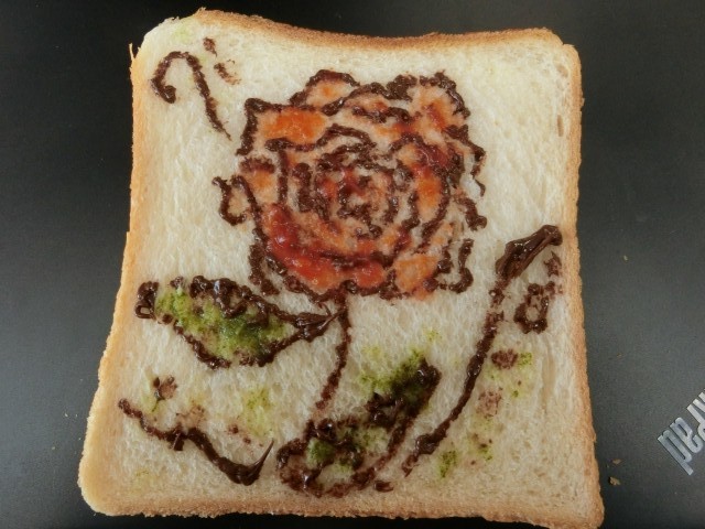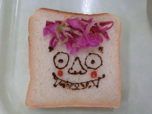 色とりどりの食材を使った「カラフル献立」となっています。また、食パンを画用紙に見立てて、チョコペンでお絵描きや文字を書き、楽しめる献立となっています。イラストは、先生方の食パンアートです。