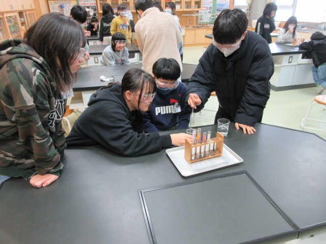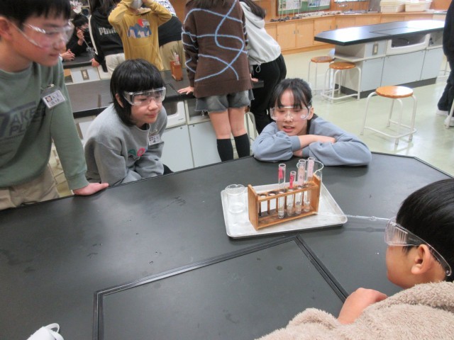 理科の学習で、水溶液の性質について実験をして確かめています。