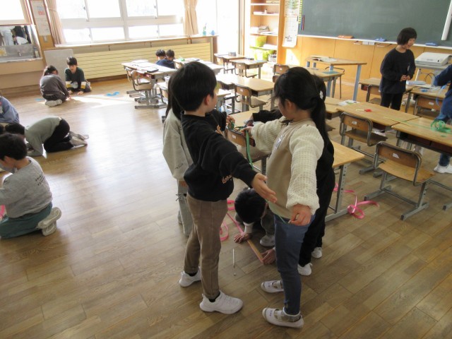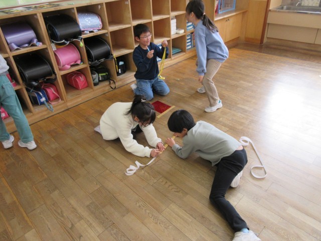 算数科の学習で、紙テープを使い長い長さを測っています。