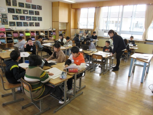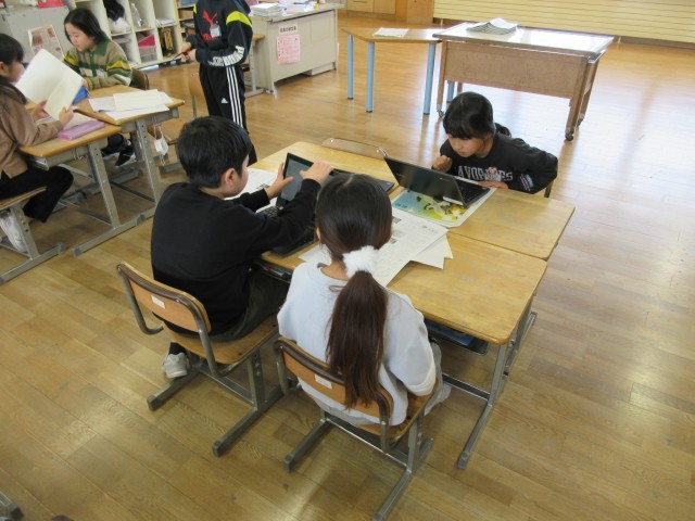 国語科の学習で、友達の考えを読み合っています。