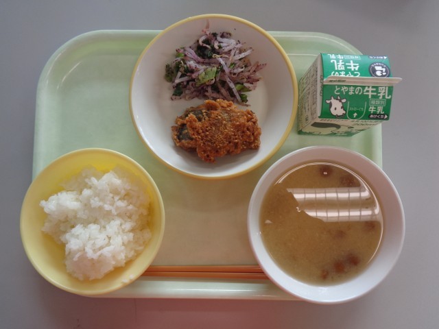 今日の献立は、ごはん、牛乳、あじの利久揚げ、ゆかり和え、なめこ汁です。