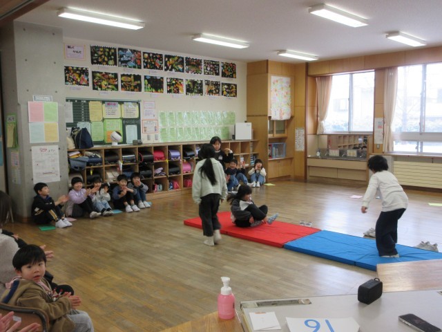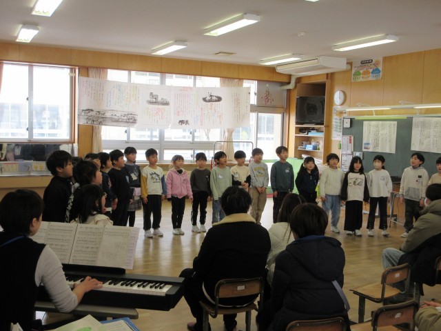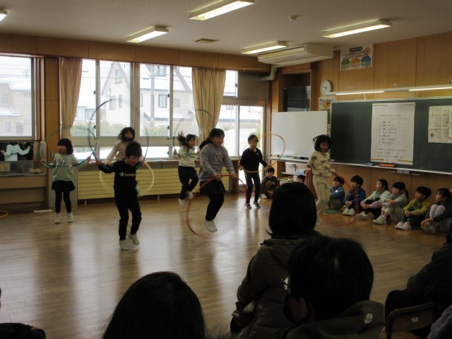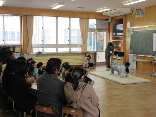 下学年は、歌を歌ったり、学習したことをまとめてクイズ形式で発表したり、マット運動や鉄棒、縄跳びなどの技を発表したりしました。技が決まった後には思わず拍手が沸きました。
