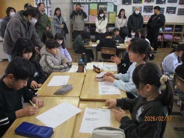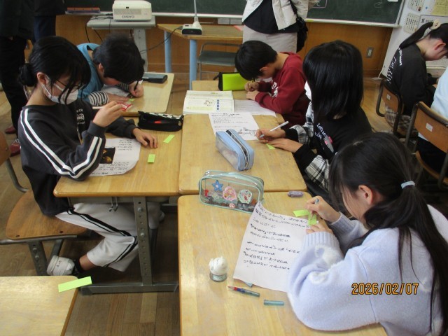 今日の参観日は、詩の紹介をしました。グループになって、友達の詩のよいところを見付け感想を書き、お互いの詩を読み合いました。