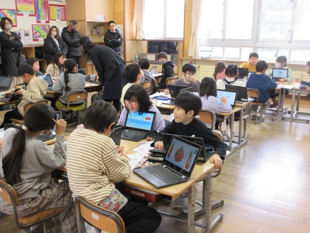 総合的な学習の時間にビオトープを含めた広場づくりをがんばった成果をグループで発表したり、What’s this?(これなぁに?)の言い回しを使った3hint Quizをスライドで作成してグループで出し合ったりと、それぞれのクラスで楽しく学習する姿を見て頂きました。子供たちは緊張しながらも、家族に見てもらえら嬉しさで満足そうでした。