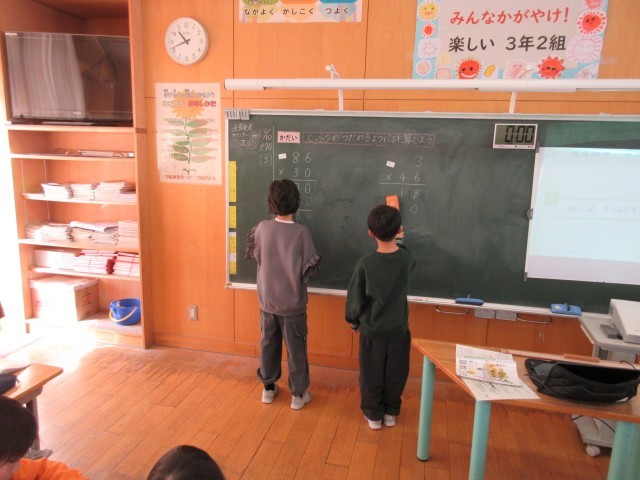 算数科の学習で、掛け算の筆算の工夫について考えています。
