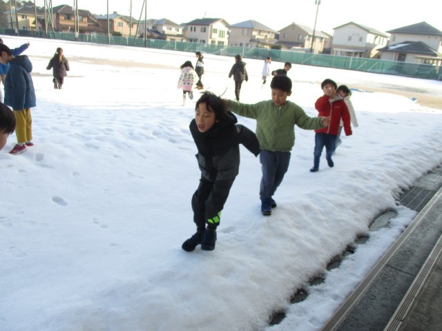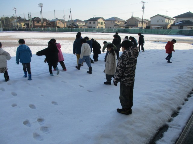 昨日までの雨も上がり、今朝はいい天気になりました。気温が氷点下になり、たくさん氷もできていました。1時間目、まだ日陰で日が当たっていないところを見付けて、そっと雪の上に乗ってみました。ズボッと足がはまるはずなのに、今日の雪はしっかり凍っていて、足が沈んでいきませんでした。条件がそろわないとできない体験ができて、とても楽しそうでした。