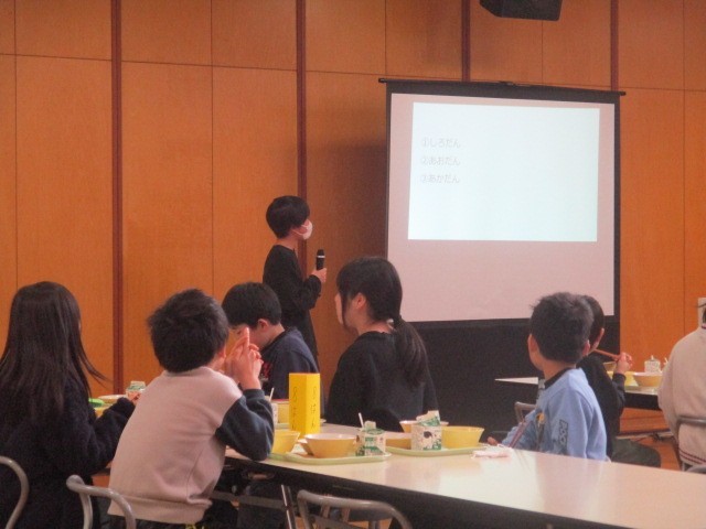 にこにこグループごとにランチルームで会食をしました。5年生が考えたクイズや質問コーナー等を楽しんでもらえました。これから青、白、黄団と続いていきます。より楽しんでもらえるようにしていきます。