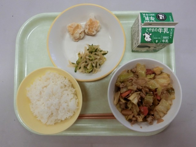 今日の献立は、ごはん、牛乳、にんじんシューマイ、甘酢和え、回鍋肉です。