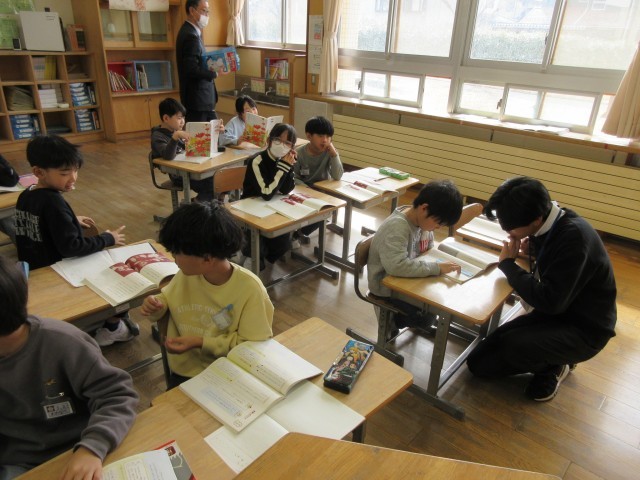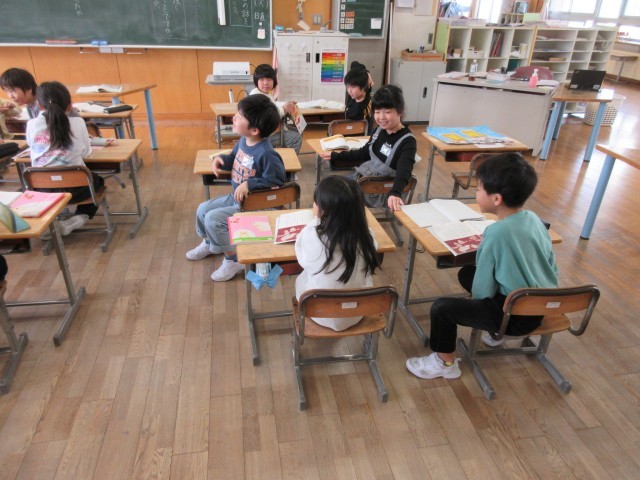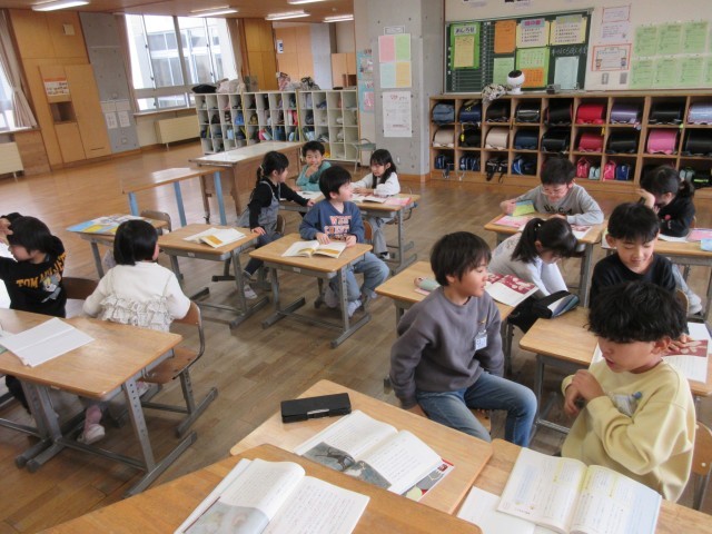 国語科の学習で、物語文を読んで感想を伝え合っています。