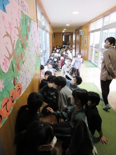 卒業を祝う集会の入場を待つ6年生です。壁に貼ってあるメッセージを嬉しそうに読んでいます。