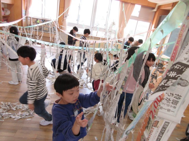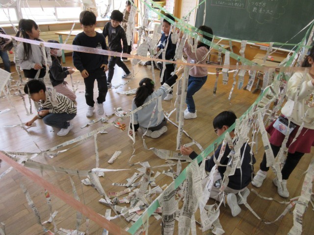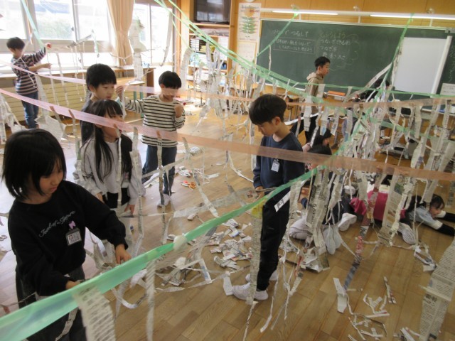 図画工作科の学習で、新聞紙を使って教室が大変身しました。