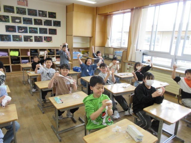 図画工作科の学習で、紙粘土をこねて作品づくりの準備をしています。
