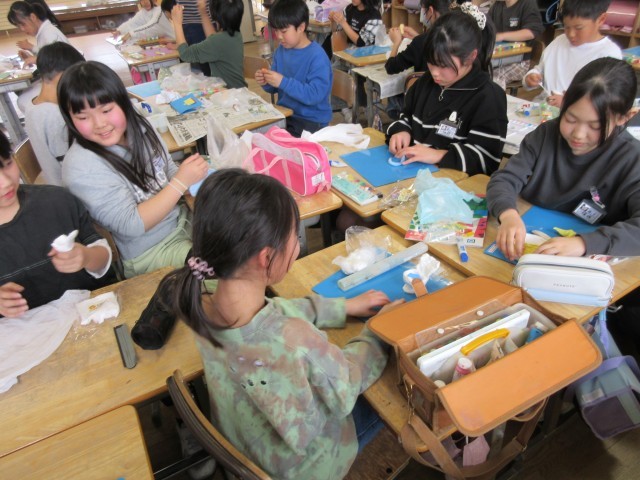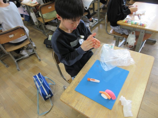 図画工作科の学習で、紙粘土を使って作品づくりに取り組んでいます。