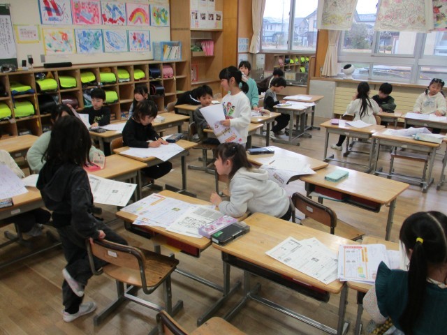 1年生は、算数の復習をしています。1年間の学びを確かめています。
