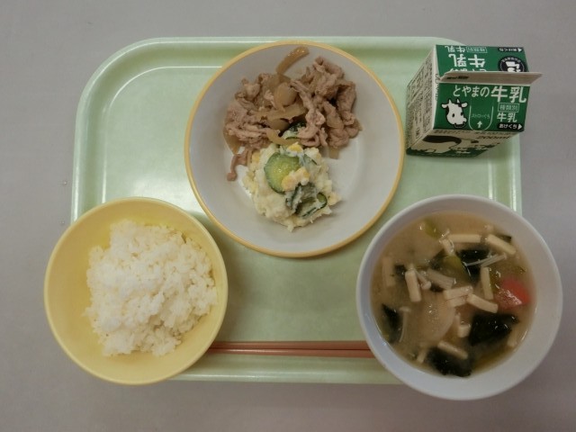 今日の献立は、ごはん、牛乳、豚肉のジャンロー、ポテトサラダ、高野豆腐のみそ汁です。