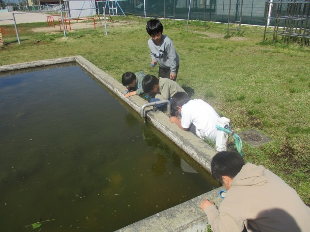 初めての理科の学習で校庭の春の生き物を探しました。