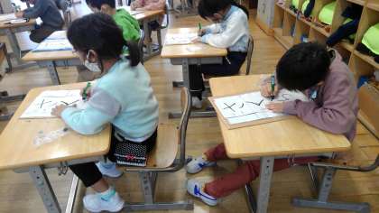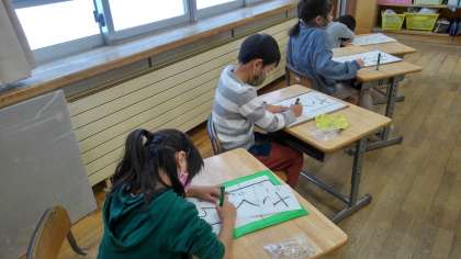 初めての硬筆墨に挑戦します。一字一字丁寧に書いています。