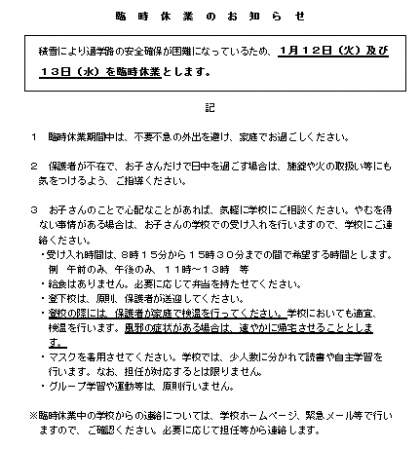 積雪により通学路の安全確保が困難になっているため、1月12日(火)及び13日(水)を臨時休業とします。配付文書でもご確認ください。