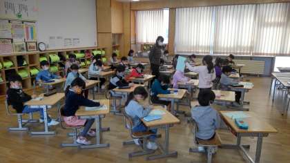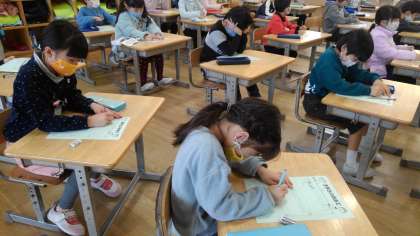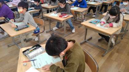 登校した子供たちは、書き初め大会の金賞作品を見たり、3学期の目当てを書いたりしています。