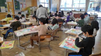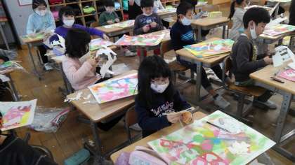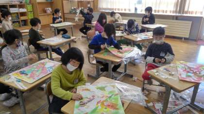 台紙の上に魚や花を切り抜いた紙を置いて、自分の想像する世界を描きます。