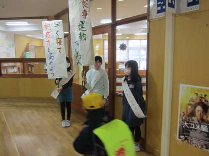 5年委員は朝も玄関で予防呼びかけを行っています。