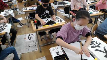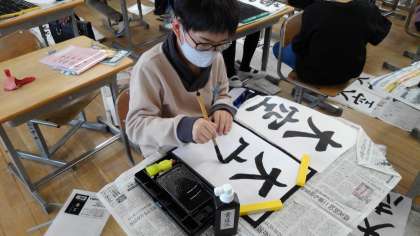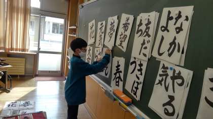卒業式や入学式の掲示のための作品を書きました。いろいろな気持ちを込めて言葉を選び、丁寧に書きました。