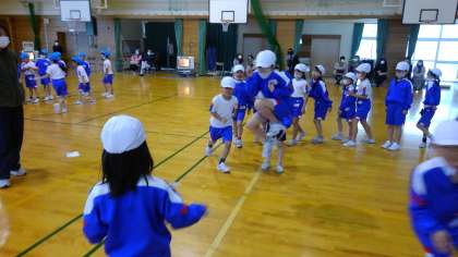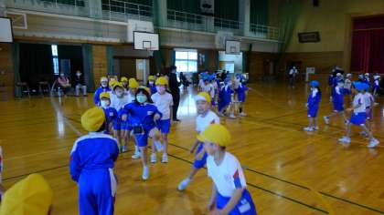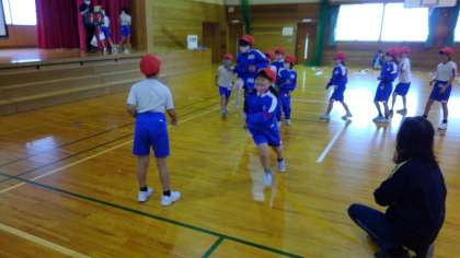 次は団体種目(2年生)、八の字跳びです。みんなで掛け声を掛け、心を一つにして、飛んでいます。