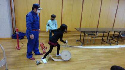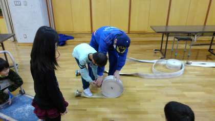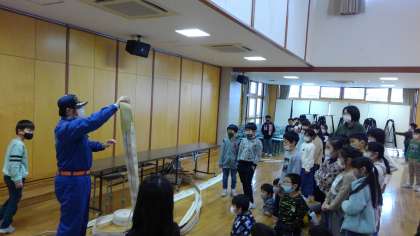 消防服やホースを実際に見せてもらったり、使わせてもらったりして、興味津々でした。
