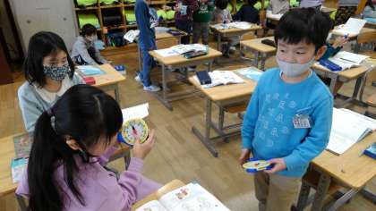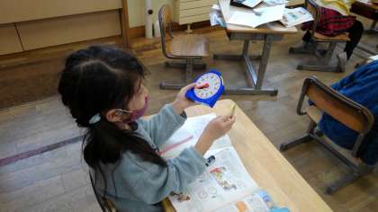 時計の学習です。実際に時計の模型を使って、時刻を表したり、読んだりしました。